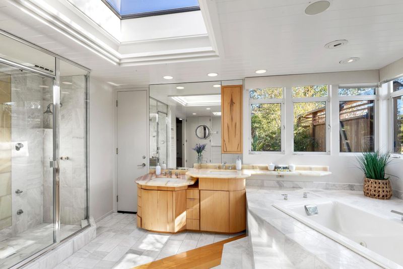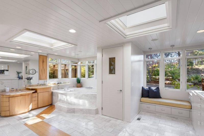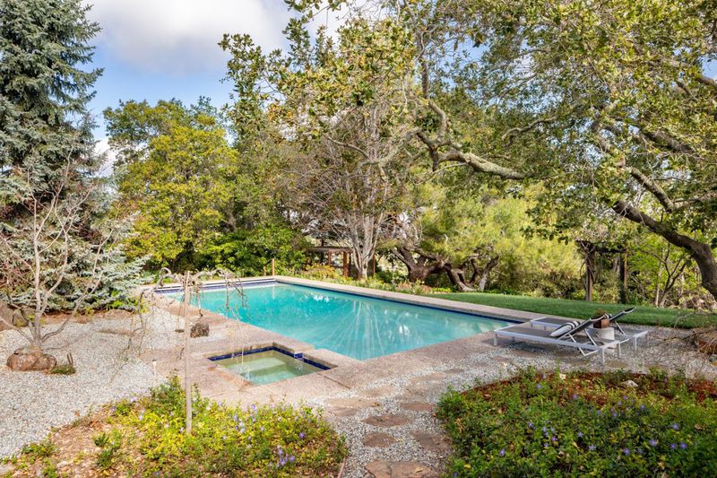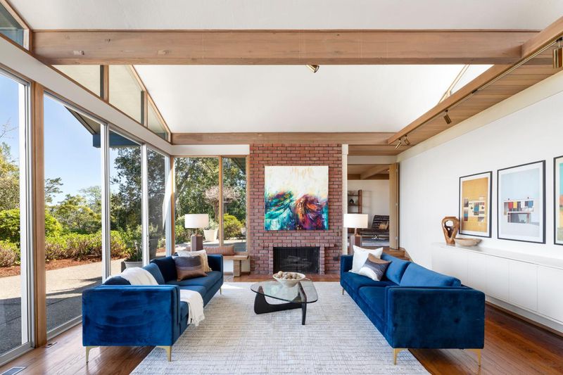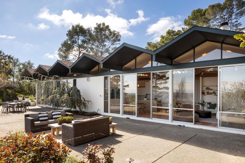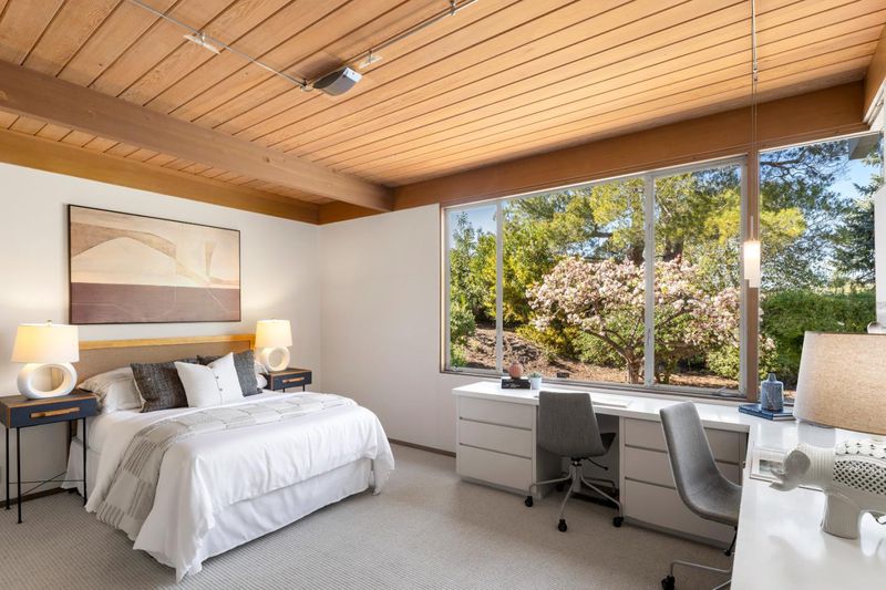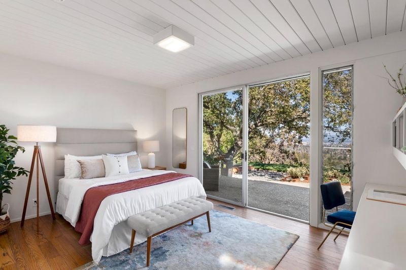 Gorgeous, unobstructed views of the bay and mid-century styling in a private setting in Woodside Hills. Situated on a 1.12-acre lot with 4 spacious bedrooms plus an office and 3 bathrooms, this single level home offers a terrific floor plan. Designed to embrace natural light with dramatic floor-to-ceiling windows and high ceilings that create an airy, open atmosphere while seamlessly connecting indoor and outdoor spaces. The large patio, seen through walls of glass throughout the home, overlooks the views and is the ideal spot for entertaining. The gardens feature mature fruit trees, charming landscaping, spaces for children to play, and a sparkling pool and spa. The 2-car attached garage and additional detached 1-car garage and a generous circular driveway provide ample parking.