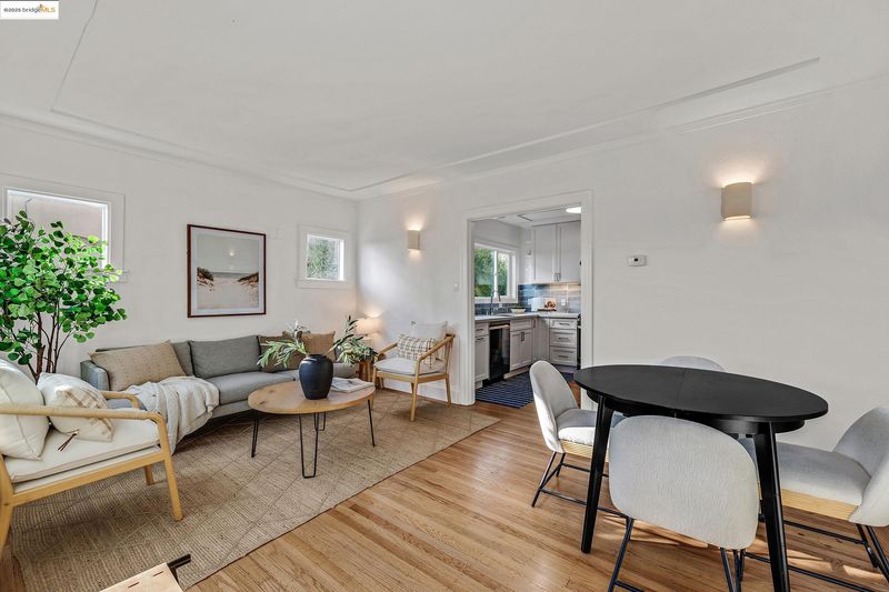 Welcome to this beautifully refreshed 2 bedroom, 1 bath bungalow that blends classic Berkeley architecture with modern style. From the bold arched entry to the sun-soaked living spaces, every corner of this home is designed to feel warm and comfortable. Step inside to discover a bright open-concept living and dining area framed by oversized windows and charming period details. The newly updated kitchen features sleek quartz counters, stainless steel appliances, new shaker cabinetry, and a tile backsplash that brings a contemporary coastal feel to your cooking experience. Both bedrooms offer generous natural light with a stylishly updated bathroom that includes modern tilework and refined fixtures. Convenience lives here too with an in-home laundry closet and an abundance of storage throughout.