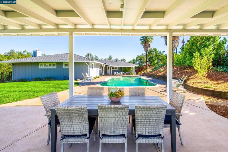 Perched on a scenic knoll in Lafayette’s coveted Silver Dell neighborhood, this light-filled ranch-style home offers sweeping views, exceptional privacy, and effortless indoor-outdoor living. The inviting floor plan features an expansive living and dining room with Mt. Diablo and hillside vistas, a chef's kitchen with stainless-steel appliances, bar seating, and a casual dinette area that opens to the family room with skylights, soaring ceilings, and a fireplace. Just beyond, a bright bonus room wrapped in glass offers flexibility for a playroom, game room, or quiet retreat filled with natural light. A private wing includes a bedroom and full bath with direct pool access, plus a nearby laundry area for added convenience. The primary suite serves as a true sanctuary with a sitting area and fireplace, spa-inspired bath, and spacious walk-in closet, while three additional bedrooms and a full bath complete the layout. Outdoors, enjoy multiple patios, a sparkling pool and spa, level lawns, fruit trees, raised garden beds, and a charming chicken coop, all surrounded by peaceful hillside views and mature landscaping. Ideal location just minutes from downtown Lafayette and Walnut Creek, hiking trails, commute routes, BART, and top-rated Lafayette schools!
