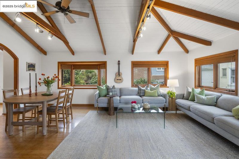 Utterly delightful top-floor condo has architectural gravitas thanks to vaulted, exposed beam ceilings and spacious airy rooms. This charmer feels and lives like a house in the core of Elmwood, a premium location minutes from the buzzy College Avenue amenities and UC campus. With its sweet front porch, dramatic living room, big dreamy kitchen, in-unit laundry and dedicated parking, it is packed with cheer, charm and utility. Green outlooks, cocoon-like privacy, gas fireplace, shared rear gardens and dedicated storage truly set this condo apart. Out and about, you’ll find a multitude of dining, shopping and recreation options within easy reach, from the University District and Downtown Berkeley to Elmwood and Rockridge.