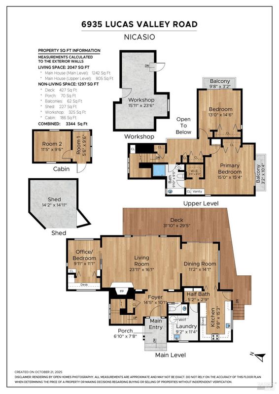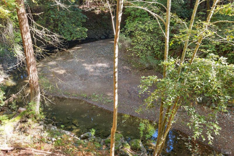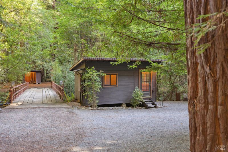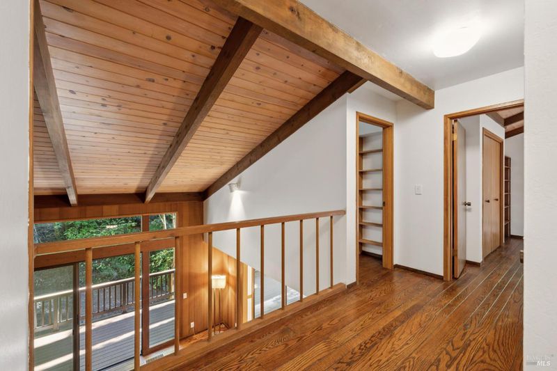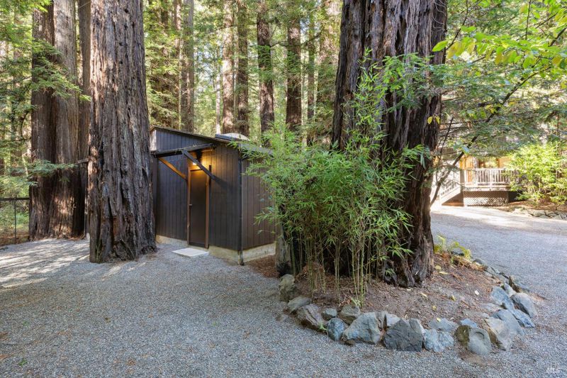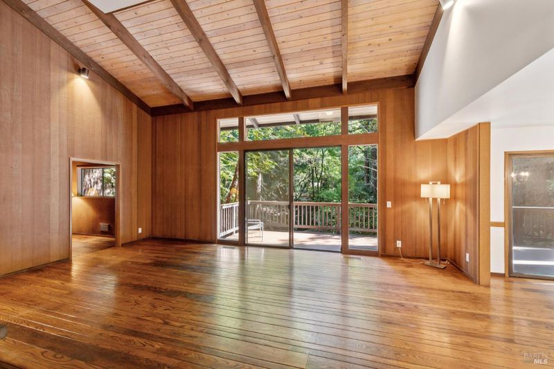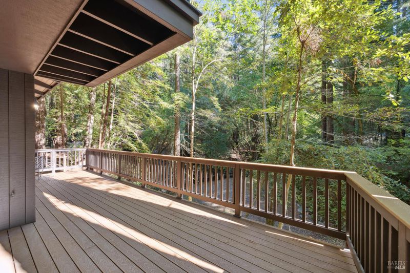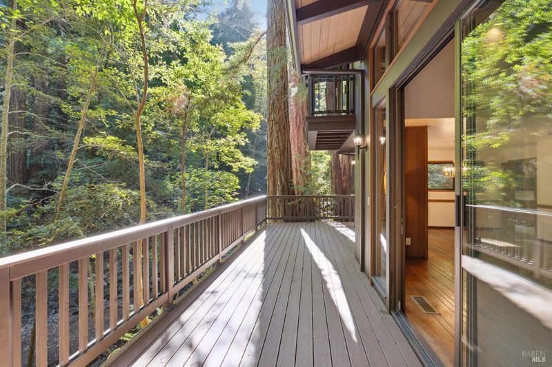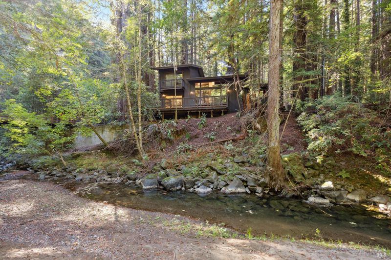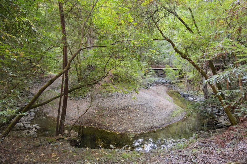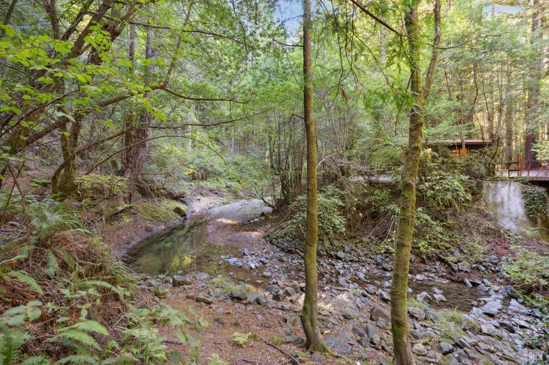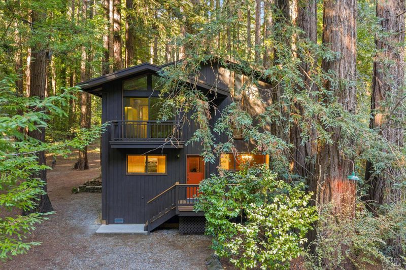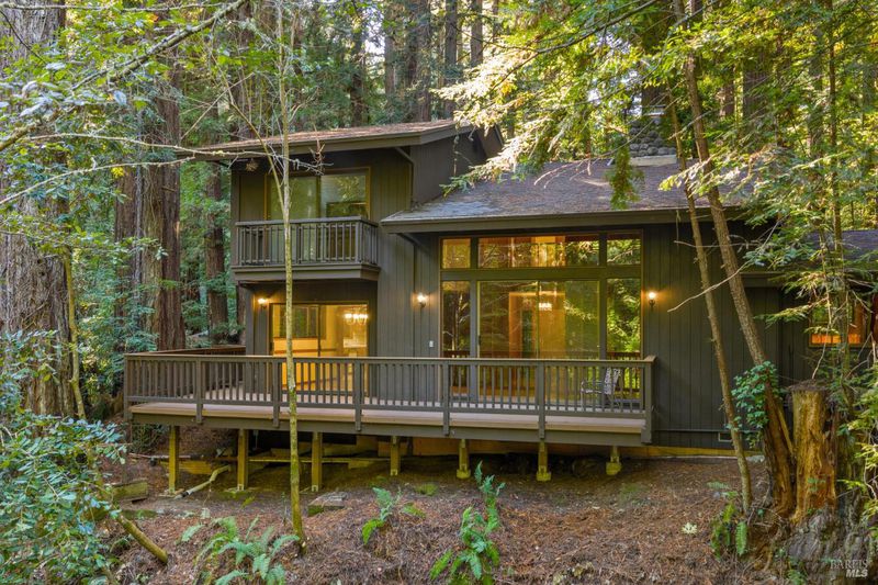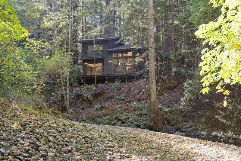 Surrounded by towering redwoods, this architecturally distinct home captures the essence of tranquility and design in a natural setting. Resting on approximately 9.8 acres with a year-round creek, this private retreat combines timeless mid-century style with the serenity of Marin's redwood forest. The two-story residence offers 2,047 sq ft of living space and an additional 1,297 sq ft of versatile structures including a detached workshop, cabin, and shed. Vaulted open-beam ceilings, warm wood paneling, and expansive windows create a stunning focal point in the main living area where natural light floods the space and glass doors open to an inviting wraparound deck. The kitchen offers custom wood cabinetry, tiled counters, and direct deck access for seamless indoor-outdoor living. Upstairs, the primary suite features a private balcony overlooking the forest, while additional bedrooms and an office provide flexible living or workspace options. The property includes a private bridge over the creek, a workshop with skylights, and multiple trails that weave through the redwoods. Offering both peace and inspiration, this nearly 9.8-acre sanctuary feels worlds away yet remains just minutes from Nicasio, West Marin, and Lucas Valley conveniences.