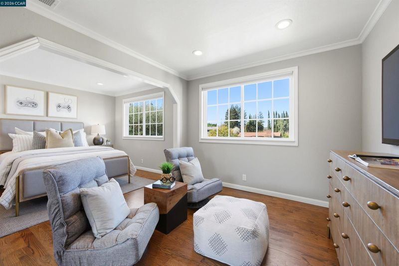 NORTHGATE NEW TO MARKET! Spacious 5 bedroom, 2.5 bath home with 3,207 sqft on a premium court lot with a large south-facing backyard + SOLAR. Formal living and dining rooms feature hardwood floors, plantation shutters and custom millwork. The updated eat-in kitchen includes granite counters, island seating, Sub-Zero refrigerator, Thermador Professional 6-burner gas cooktop, double ovens and dishwasher, with French doors opening to the backyard. The adjoining family room offers built-in shelving and a gas fireplace, while a separate large bonus/game room provides additional living space with French doors to the patio. Upstairs primary suite includes a sitting area, Mount Diablo views, walk-in closet and updated bath with dual sinks. Additional highlights: hardwood flooring through much of the home, dual A/C units, Tesla Powerwalls, new water heater, 3-car garage with attic storage and indoor laundry. Close to Northgate’s top-rated schools, parks, trails, swim clubs, shopping and dining.