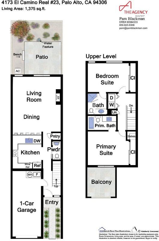 Beautiful updates and abundant natural light highlight this townhome at the rear of the desirable Camino Place community. The skylit open-concept living area, with granite-finished kitchen and counter seating, connects to a private garden patio for outdoor enjoyment. Two upstairs bedroom suites, one with sunny balcony, each have an ensuite bath, plus a half-bath serves the main level. Additional amenities include a laundry closet, attached one-car garage, central air conditioning, and a community pool and spa. Perfectly located in the heart of Silicon Valley and minutes to Stanford University, this is an excellent option for starting out, moving up, or downsizing with access to renowned Palo Alto schools.