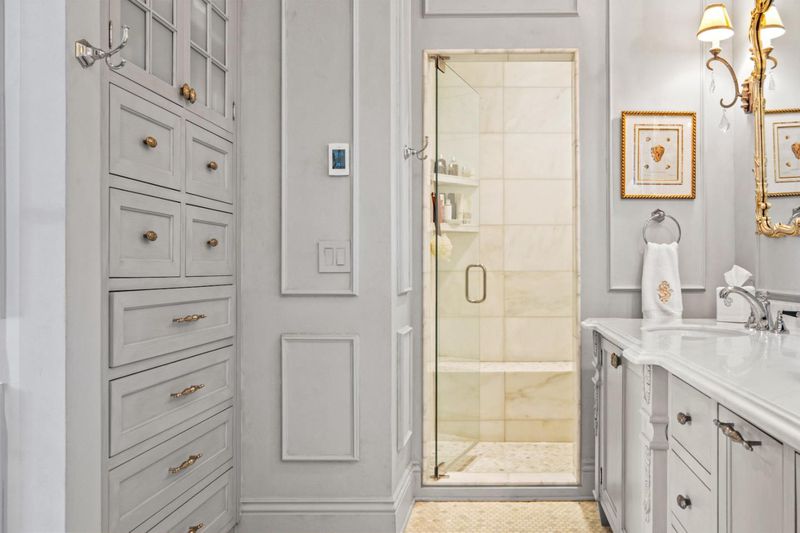 - Double Sinks, Full on Ground Floor, Marble, Primary - Oversized Tub, Skylight, Stall Shower - 2+, Steam Shower, Tub in Primary Bedroom, Updated Bath