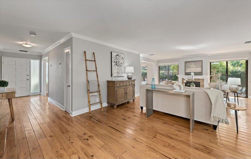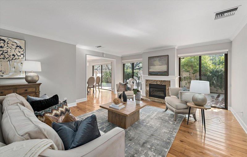 Arrive through the gates of prestigious Creekside Oaks and be welcomed by a serene grotto-style pond and fountain that instantly sets a tone of tranquility. This beautifully maintained community offers resort-style amenities including two pools, spa, and bocce court surrounded by lush landscaping. This coveted single-level 2BR 2BA + office home offers approx. 1,840 +/- SF with warm hardwood floors and a private outdoor atrium with trees and flowers visible from nearly every room. The remodeled kitchen features white quartz countertops, top-of-the-line stainless appliances, and a bright morning-sun breakfast nook with large windows and classic Boston shutters. The formal dining room opens to a tiled patio stretching along the home, perfect for indoor-outdoor entertaining or relaxing evenings. Skylights and multiple sliding glass doors fill the home with natural light. The spacious primary suite offers patio access, dual closets, and a private bath with separate tub and shower plus serene atrium views. Convenient access to Hwy 280 provides quick connections to downtown Los Altos, shopping, dining, parks, and major Silicon Valley employers, making daily living both comfortable and convenient in this desirable Los Altos location.