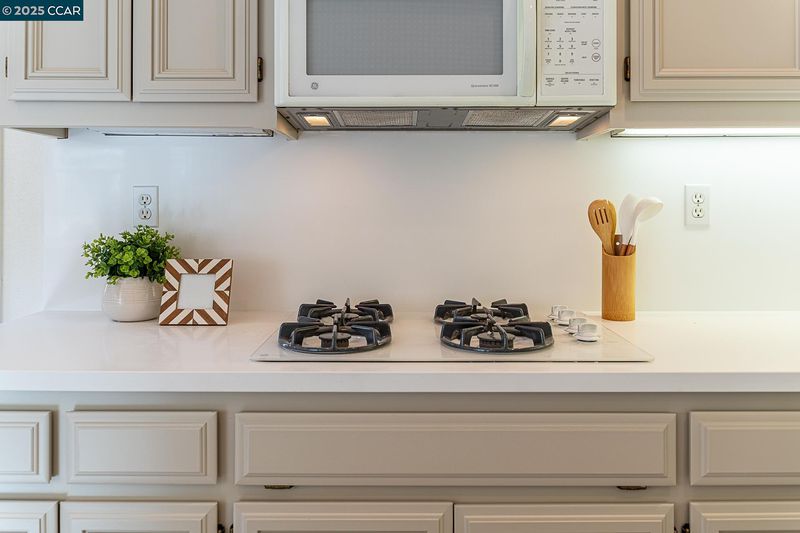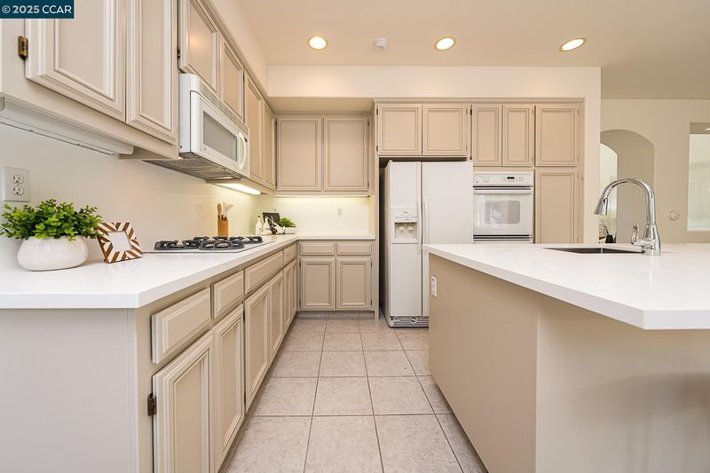 - Gas Range, Plumbed For Ice Maker, Oven, Refrigerator, Gas Water Heater, 220 Volt Outlet, Counter - Solid Surface, Eat-in Kitchen, Gas Range/Cooktop, Ice Maker Hookup, Kitchen Island, Oven Built-in, Updated Kitchen