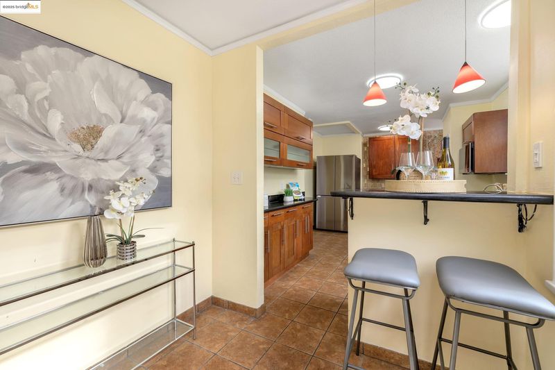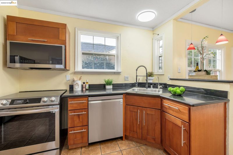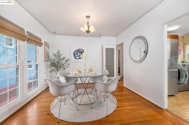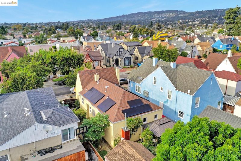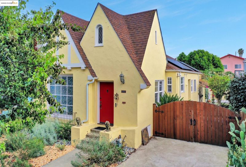 Step into storybook charm in this 1929 Tudor bursting with character and modern upgrades. Behind its cheerful stucco exterior and arched entry lies a warm, light-filled home with refinished hardwood floors, a cozy living room with vaulted beamed ceiling, and a sunny dining area that flows into an updated eat-in kitchen. The kitchen features stainless appliances, and a charming breakfast nook perfect for morning coffee. Two comfortable bedrooms and a refreshed bath create a thoughtful layout all on one level. Energy-saving owned solar panels and forced-air heat add comfort and efficiency. Outside, enjoy a fenced backyard ideal for entertaining, gardening, or relaxing under the California sun. The detached garage and off-street parking provide convenience and extra storage. Located just minutes from BART, shopping, and freeway access, this enchanting Tudor blends vintage character with modern livability in the heart of Oakland.