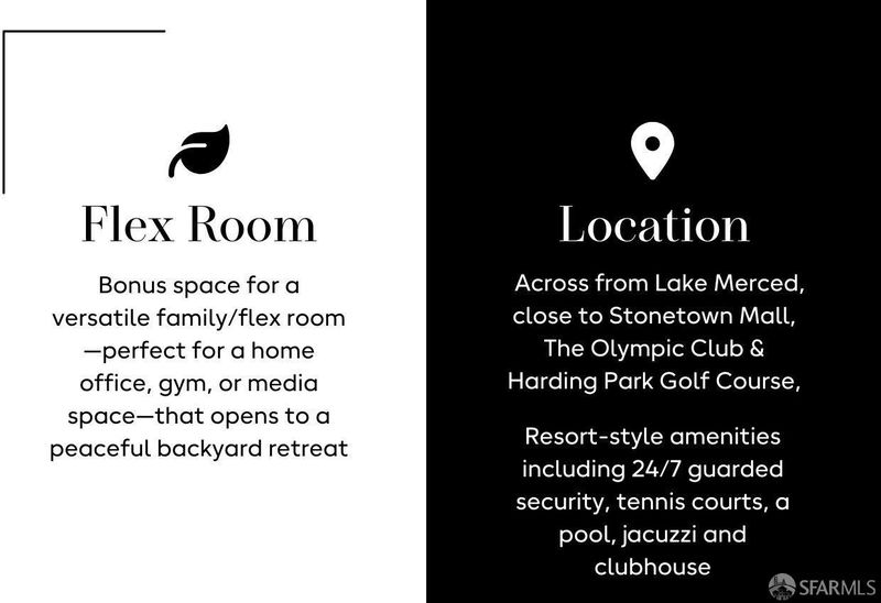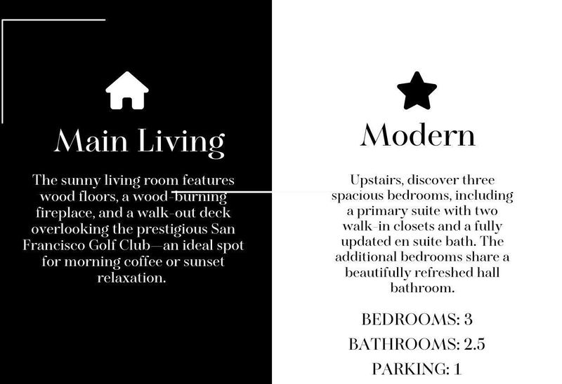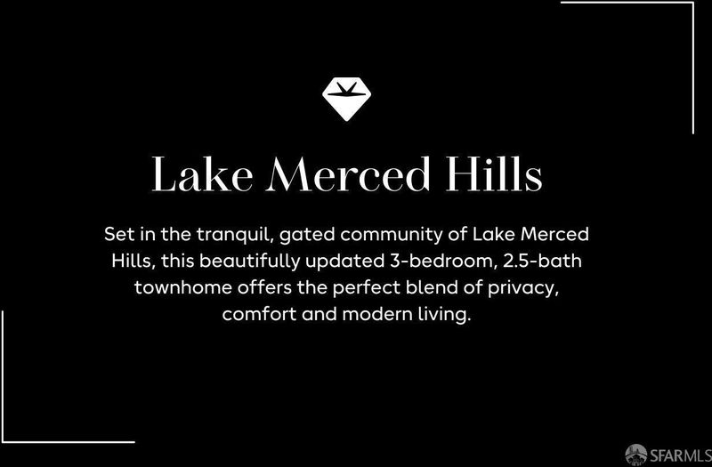 Tucked within the peaceful, secure gated community of Lake Merced Hills, this beautifully updated 3BD/2.5BA tri-level townhome is filled with natural light and surrounded by lush greenery. The sunny living room features a wood-burning fireplace and a private deck overlooking the San Francisco Golf Clubperfect for morning coffee or evening sunsets. A spacious dining room and upgraded kitchen with new stone counters, breakfast bar, cozy dining nook, office area and all-new appliances create an inviting space for gathering. Upstairs, three spacious bedrooms include a serene primary suite with two walk-in closets and a luxe ensuite bath as well as 2 large bedrooms with a shared, remodeled hall bath. The lower level offers a versatile flex roomideal for an office, gym, or media spaceplus laundry, ample storage, and garage access. Enjoy resort-style amenities including 24/7 security, pool, spa, tennis courts, and clubhouse. Moments from Lake Merced, SFSU, Stonestown, Olympic Club, and Harding Parkthis special home blends tranquility, comfort, and convenience in one of San Francisco's hidden gems.