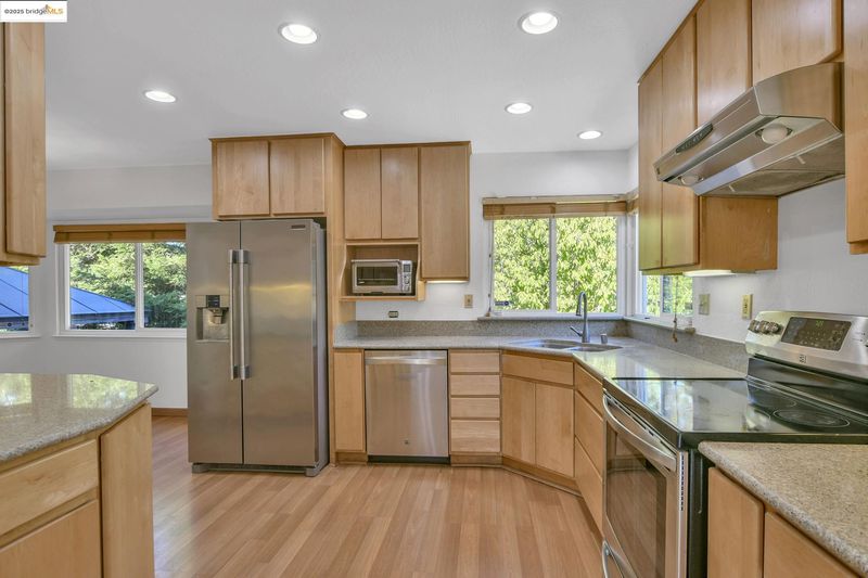 - Dishwasher, Electric Range, Plumbed For Ice Maker, Microwave, Free-Standing Range, Refrigerator, Self Cleaning Oven, 220 Volt Outlet, Counter - Solid Surface, Electric Range/Cooktop, Disposal, Ice Maker Hookup, Pantry, Range/Oven Free Standing, Self-Cleaning Oven, Updated Kitchen