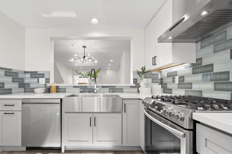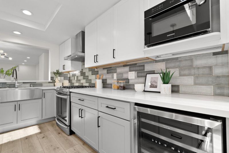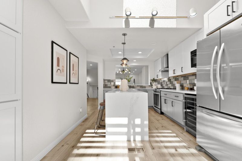 - Countertop - Quartz, Dishwasher, Hood Over Range, Island, Oven Range - Gas, Refrigerator, Skylight, Wine Refrigerator