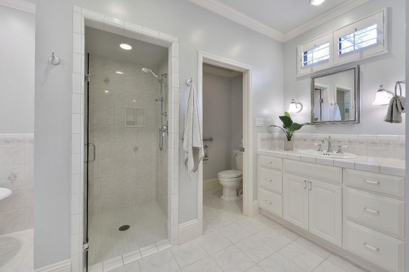 - Double Sinks, Shower and Tub, Skylight, Stall Shower, Tile, Tub, Updated Bath