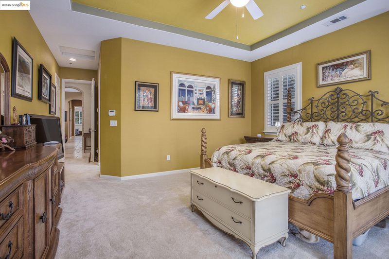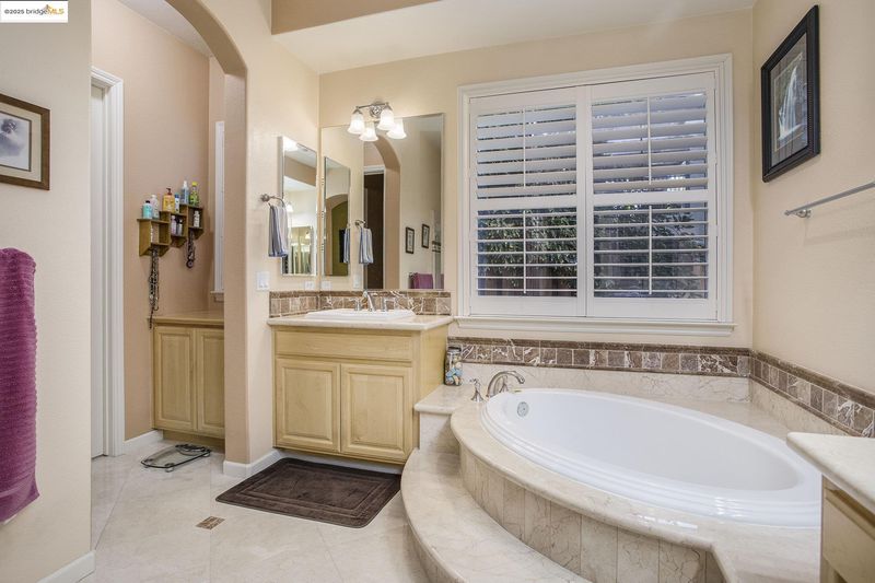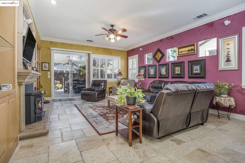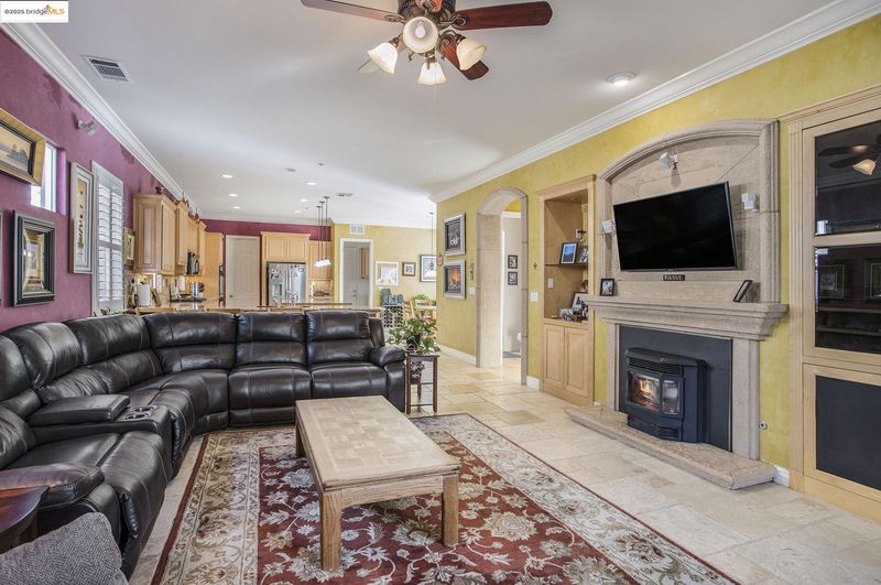 Stunning 4BR + den single-story retreat with gated courtyard & outdoor gas fireplace. Enter through a dramatic turret-style foyer into an open-concept living space with rock-tiled openings, tumbled travertine floors, crown molding, and plantation shutters. The gourmet kitchen impresses with blonde maple cabinetry, granite counters, double ovens, gas cooktop, second prep sink, two kitchen bars, and expansive walk-in pantry—perfect for entertaining. Family room with custom media wall & gas fireplace insert. Luxurious primary suite with spa-inspired marble bath, soaking tub, and oversized walk-in closets. Laundry room with sink plus included washer, dryer & refrigerator. Outdoor paradise features heated pool & spa with waterfall, built-in BBQ & smoker, outdoor fireplace, landscape lighting, and all backyard furniture included. 32 owned solar panels and 10 pool panels offer energy-efficient, low-maintenance luxury.